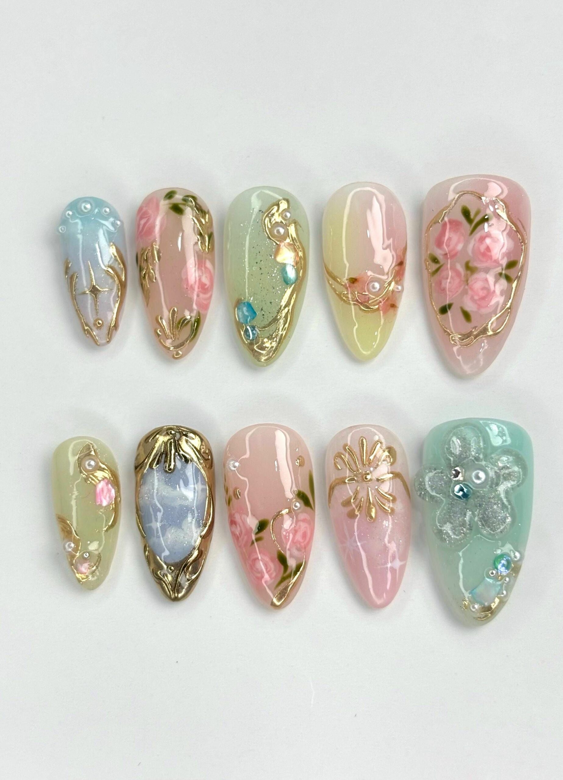 Hand-painted floral nail designs by Crabbynailz for a unique and trendy nail art look.