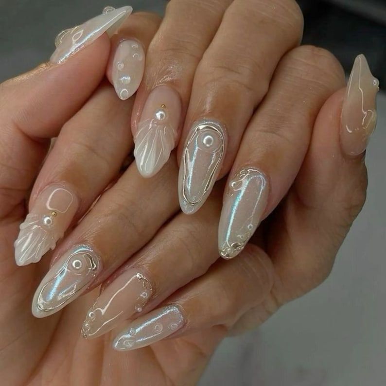 “Ocean-Inspired Almond Shell Nails – Summer Mermaid Manicure Set from Pearl Nails on Etsy”