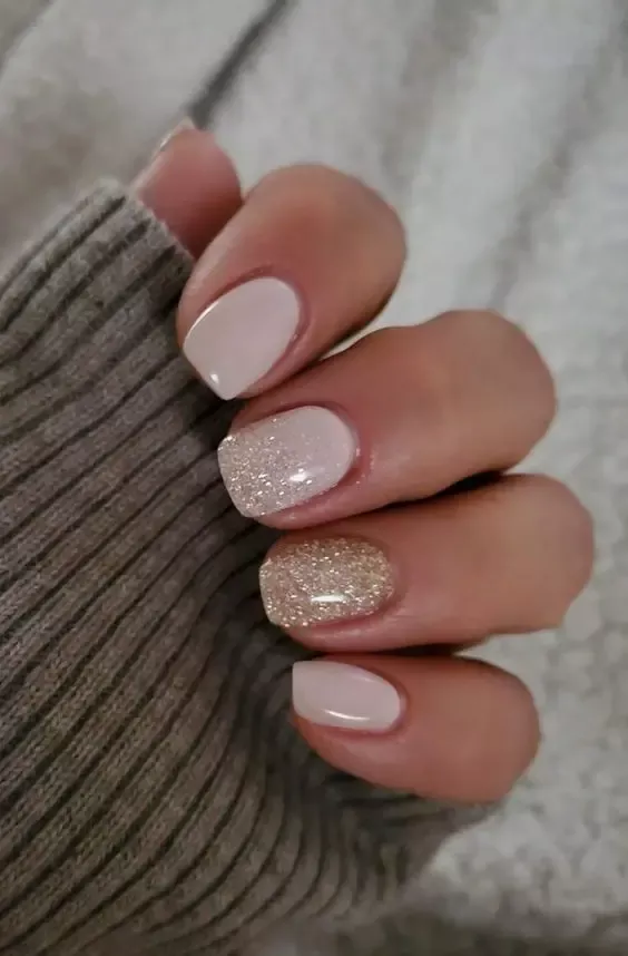 Celebrate the occasion with champagne-inspired nails. Paint your nails with a nude or light pink base color, and then add shimmering gold glitter to the tips to mimic bubbles. You can even add a small rhinestone to represent a champagne cork.
