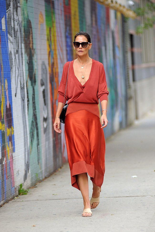 Layering is essential for fall, and Katie Holmes knows how to do it with style. To emulate her look, mix and match different textures and fabrics to create dimension in your outfit. Try layering a turtleneck under a blazer or a cropped sweater over a dress for a fashionable and cozy ensemble.