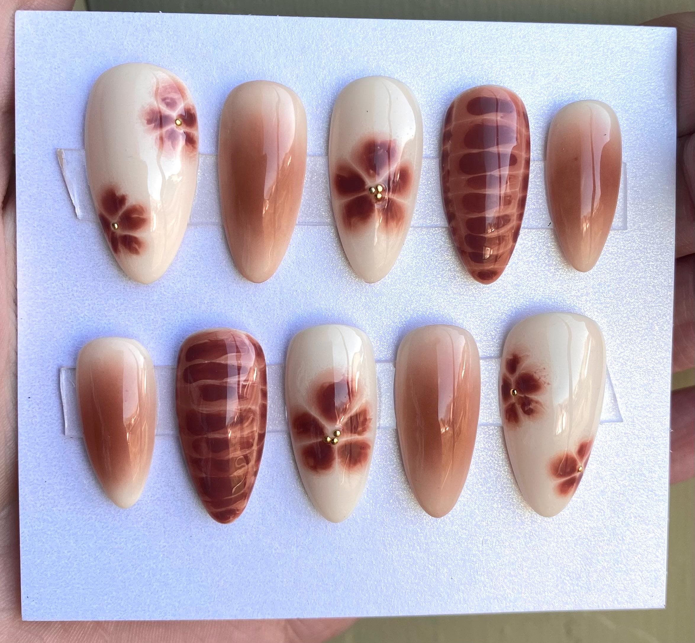 Autumn Herbst Press On Nails Floral Ombre – Almond Nails – Hand-painted – Gel Acrylic.
