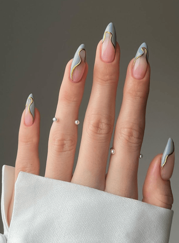 Description: Explore the latest trend in nail art with beautiful almond-shaped nails featuring elegant gray details.