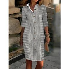 Women’s Casual Button Print Shirt Dress in Blue Green Striped Cotton Linen – 2024 Collection