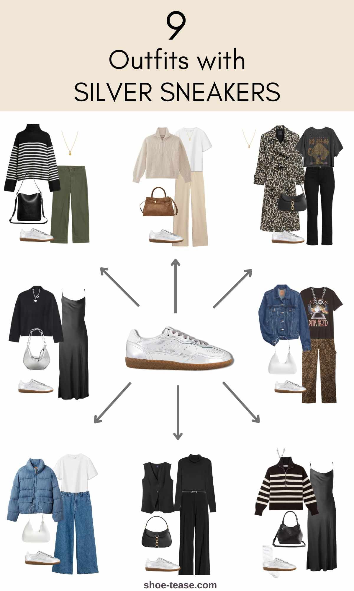 “9 stylish Fall/Winter outfits featuring silver sneakers for a trendy and comfortable look.”
