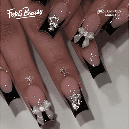 “24pcs Long Coffin Fake Acrylic Nails with Small Fragrance Bow Star Diamond Design – Black Press on False Nails by Fofosbeauty”