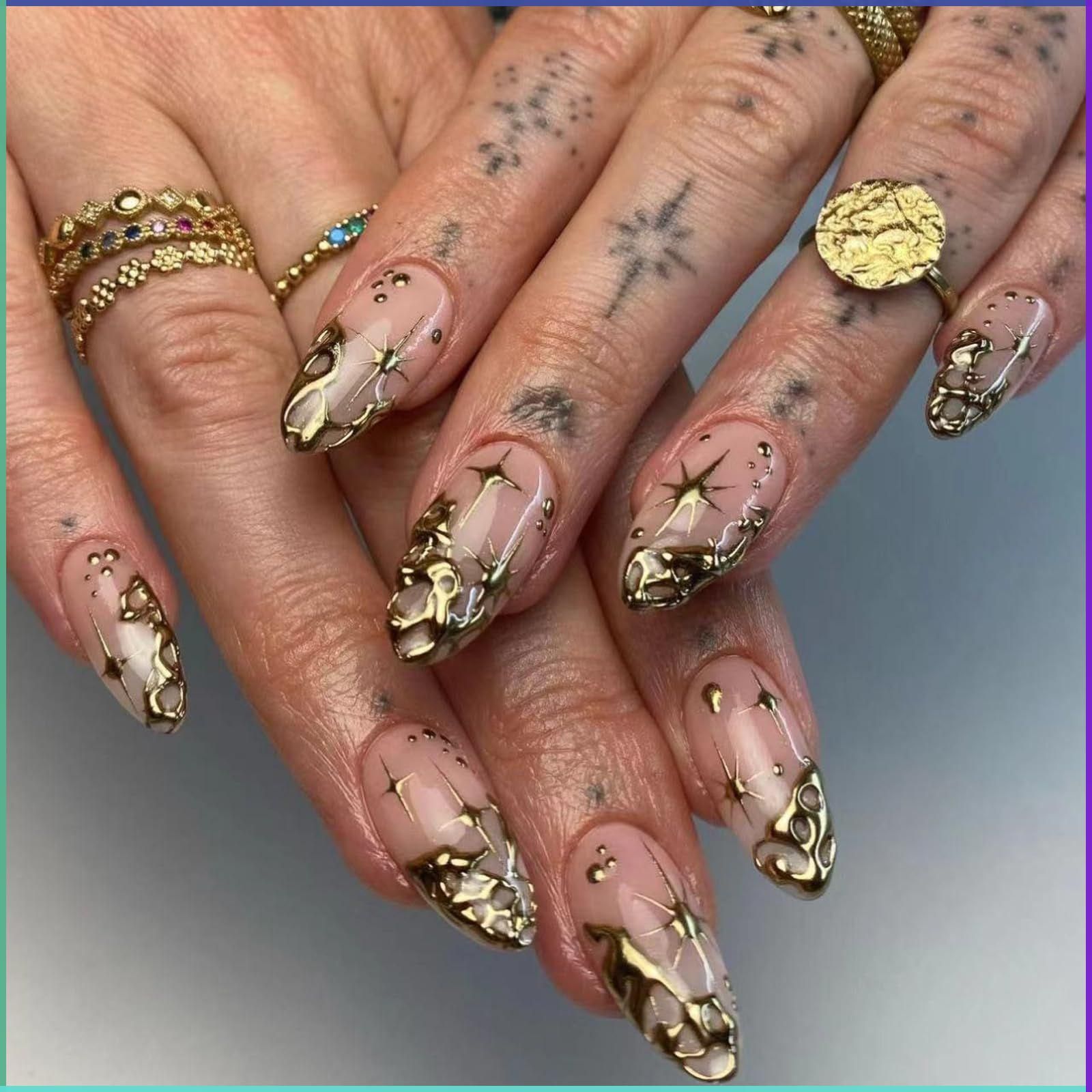 Almond Press on Nails Medium Stiletto Fake Nails Glossy Bling Aurora French Tip Gold Swirl.