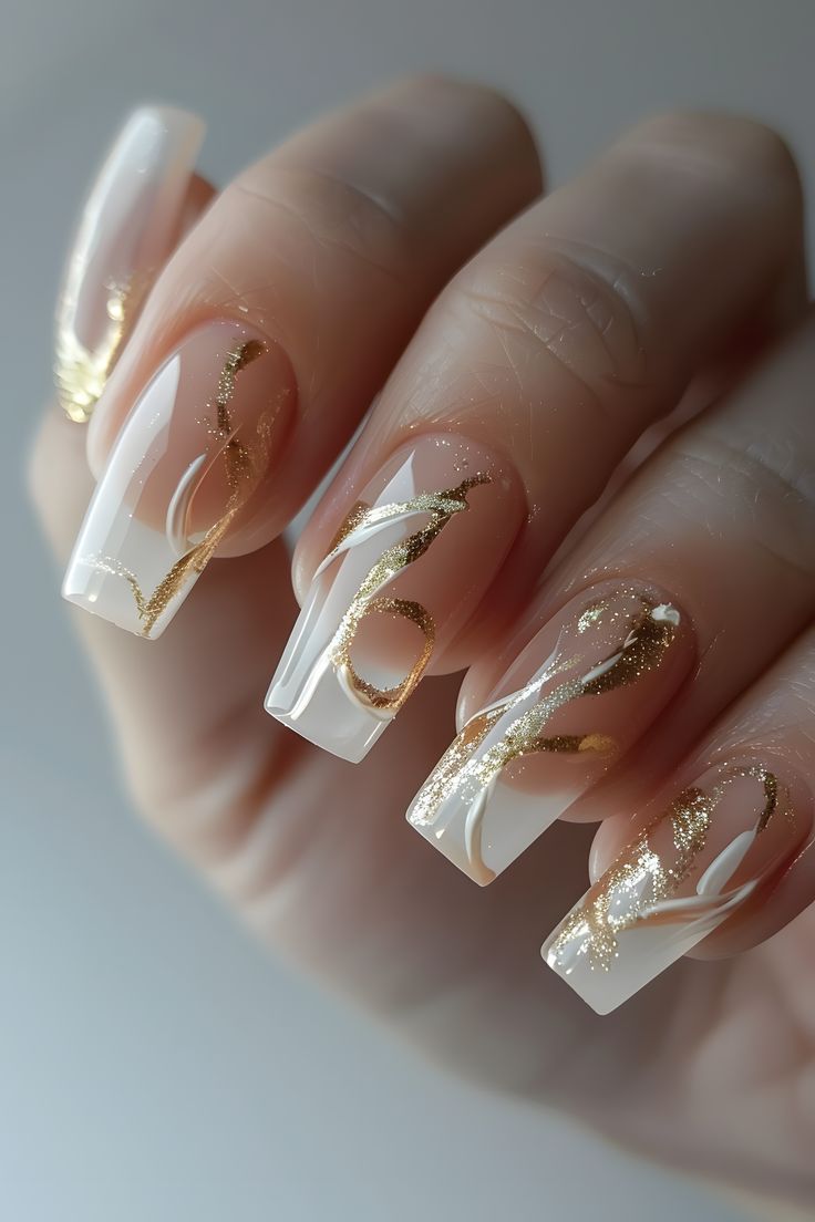 “Elegant beige nails with gold foil swirls, perfect for a wedding day, adding a touch of luxury.”