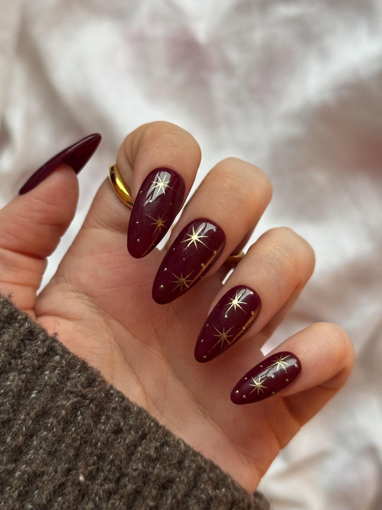 Hand-painted burgundy star press-on nails set with gold chrome stars for salon-quality autumnal style.