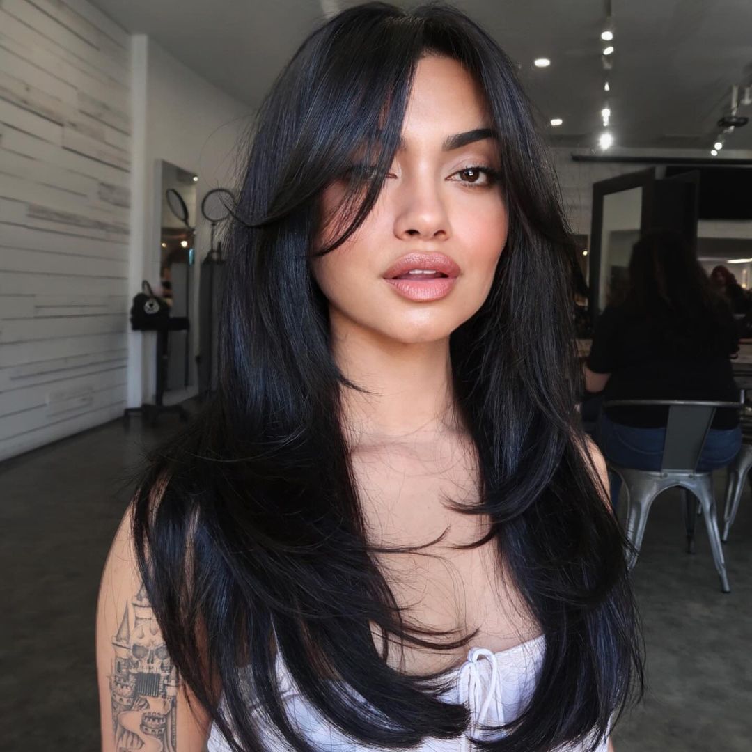 description Fall hair color trend for brunettes in 2024: sleek black with trendy curtain bangs hairstyle.