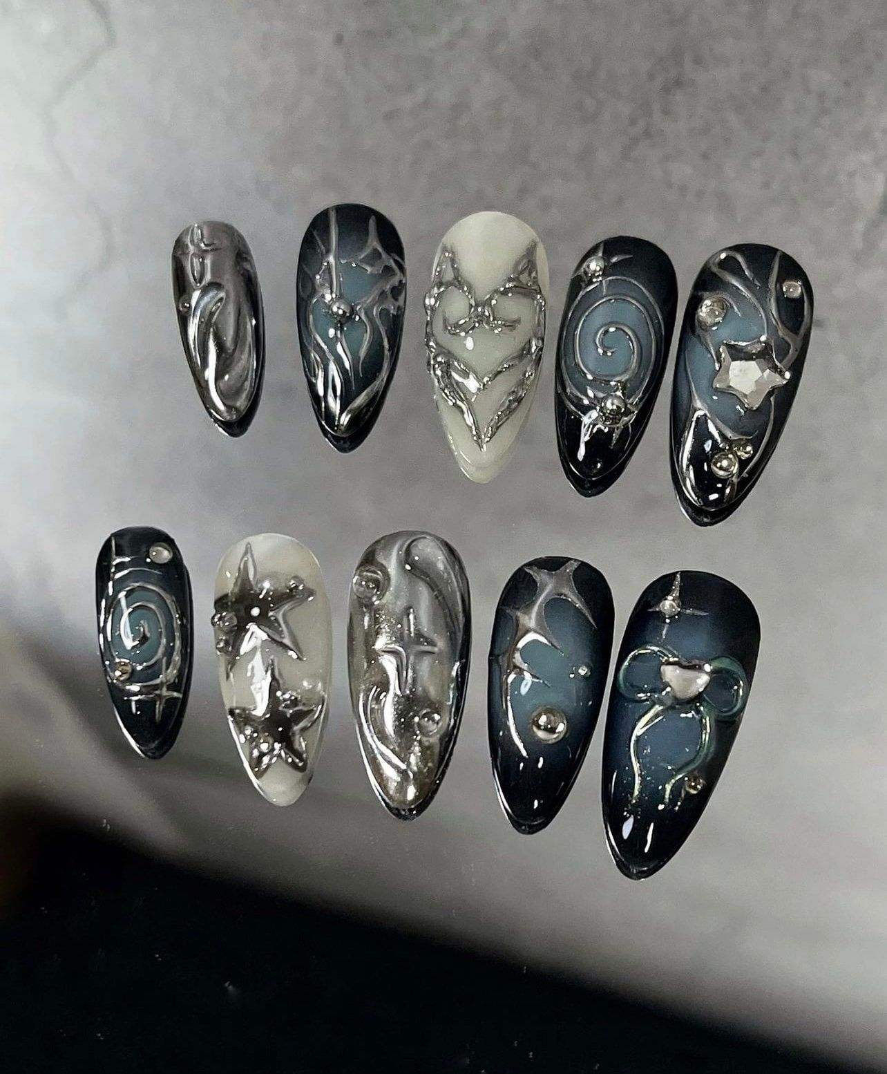 Y2K black silver chrome custom press on nails for a sleek and stylish look. Handmade and trendy.
