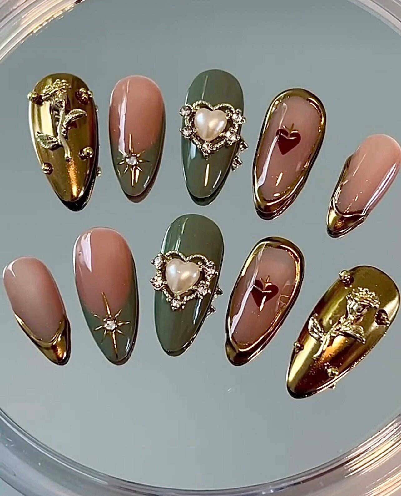 Hand-painted Golden Rose Press on Nails, Customized Faux Acrylic & Gel Nails, Handmade Press on Nails.