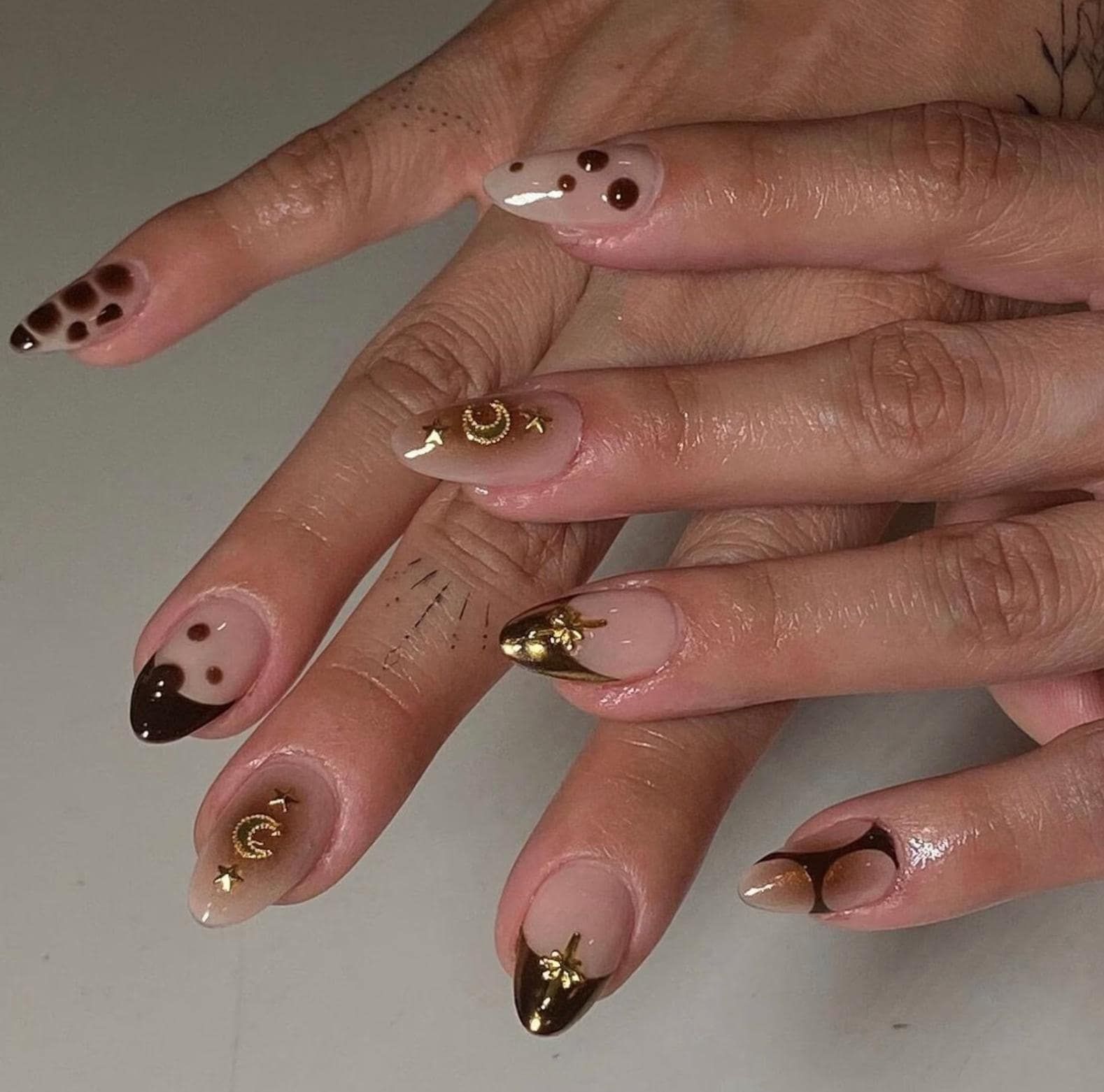 handmade French nails in golden brown/ faux acrylic nails/ gel nails/ handcrafted nails/ handcrafted nails.