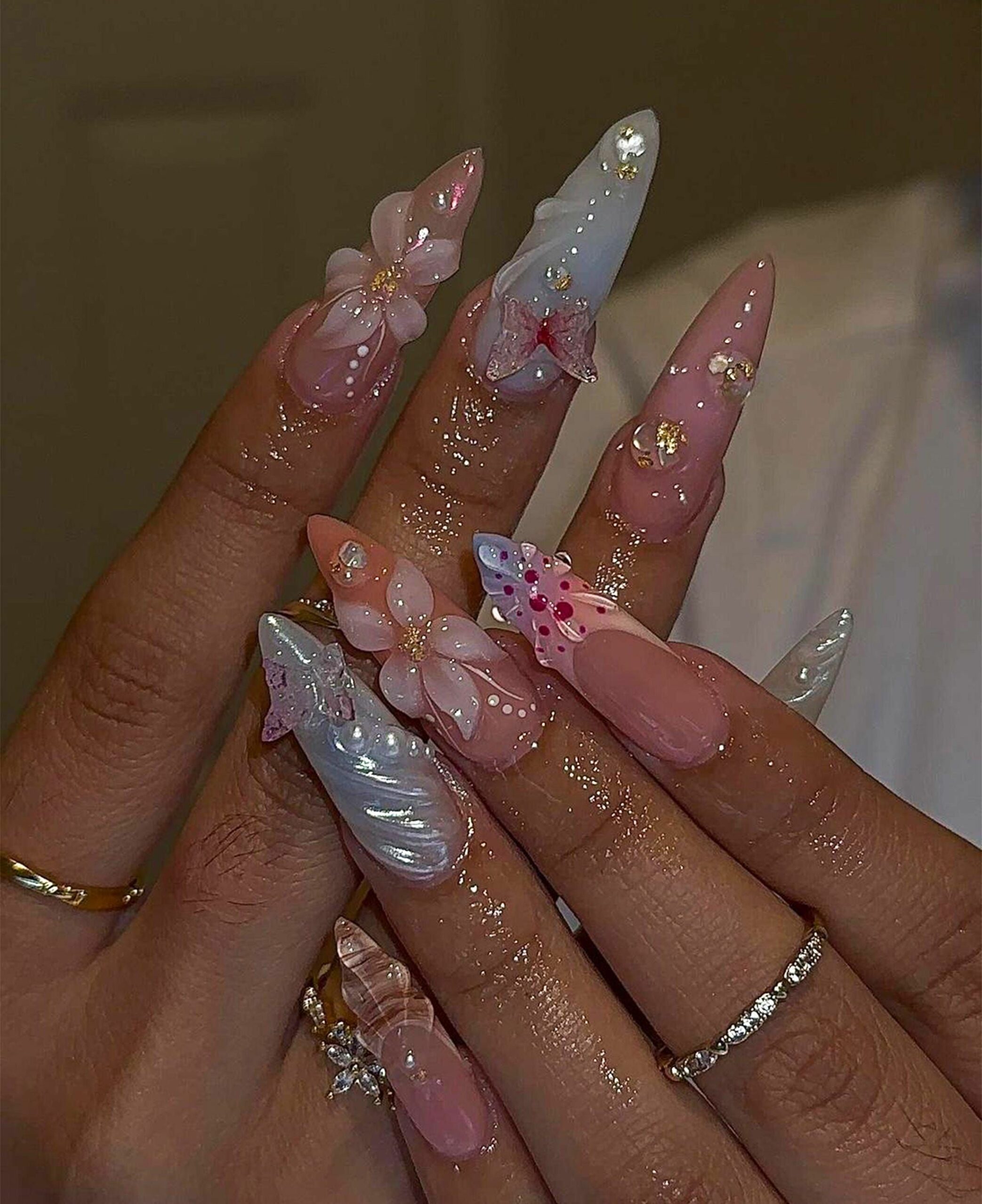 Handmade luxury press-on nails with 3D flowers and butterfly accents for romantic nail art.