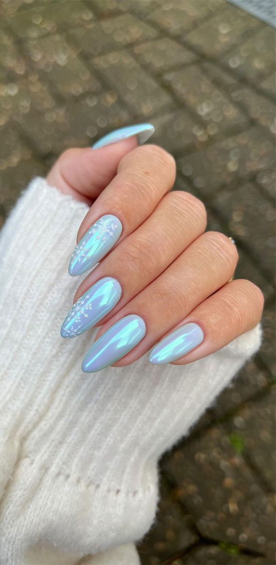 “Get into the holiday spirit with these stunning icy blue nails adorned with delicate snowflakes.”