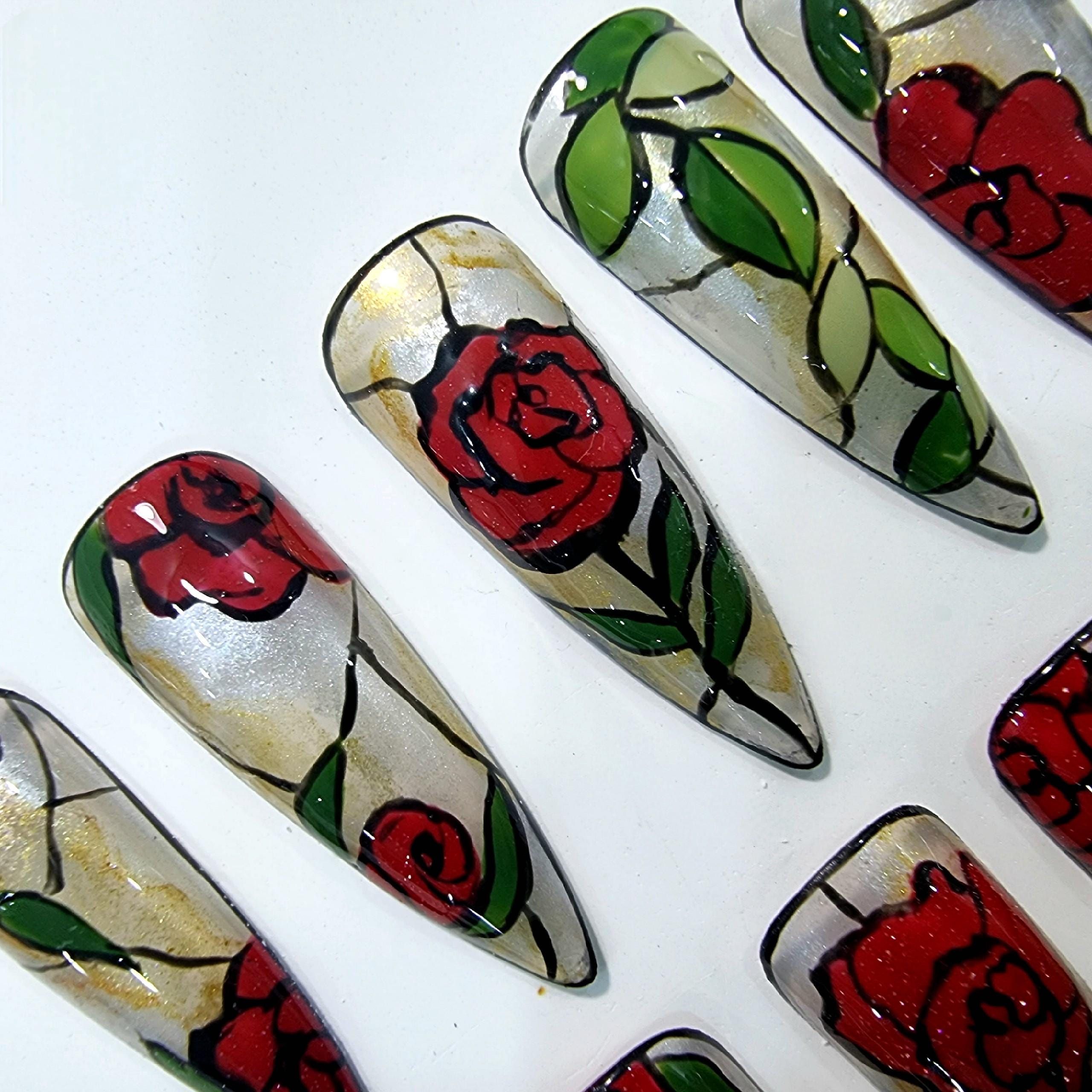Hand-painted enchanted rose press on nails – Beauty and the Beast inspired gothic nails.