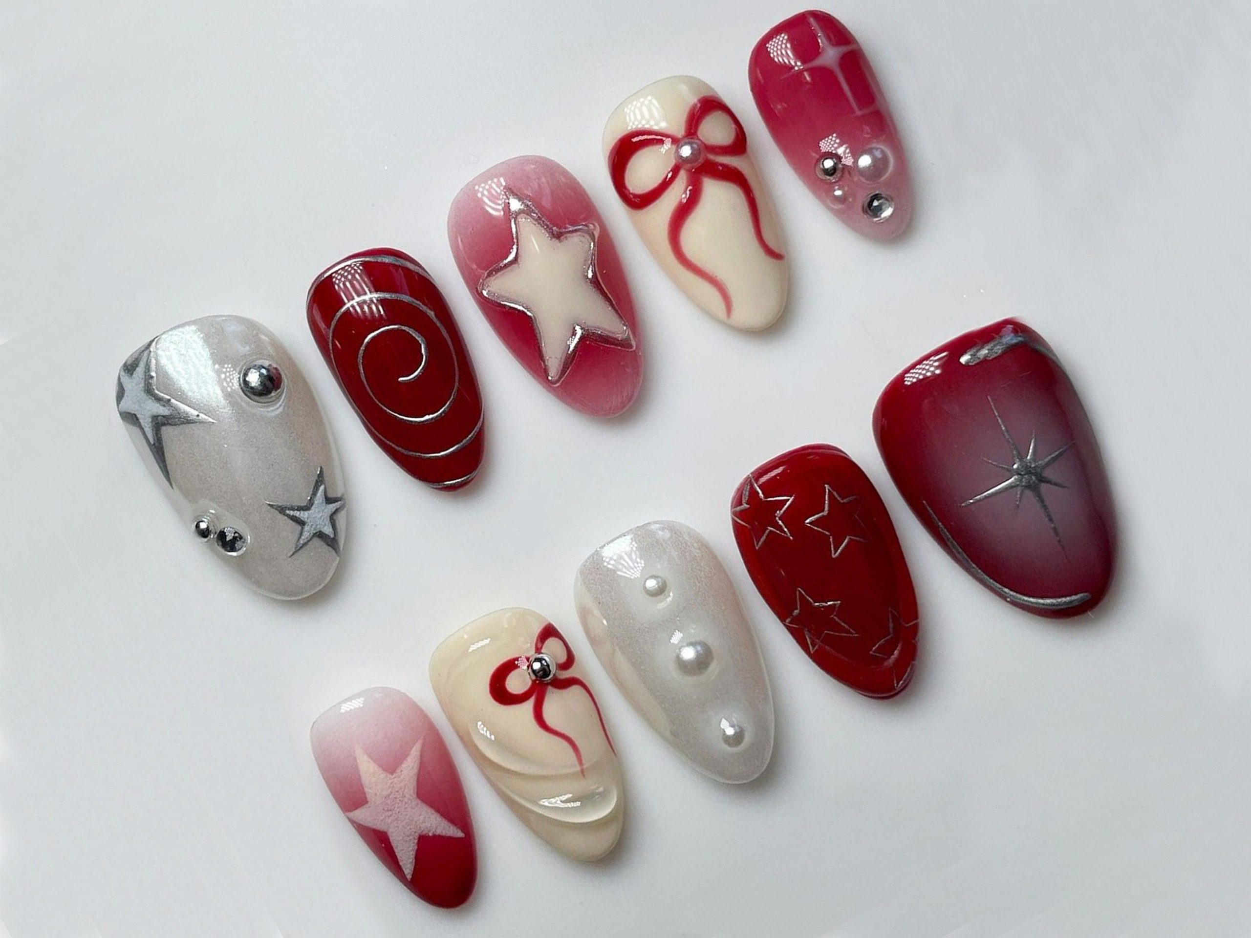 “Y2k Inspired Red and White Press On Nail Set with Unique Chrome Designs – JT286”