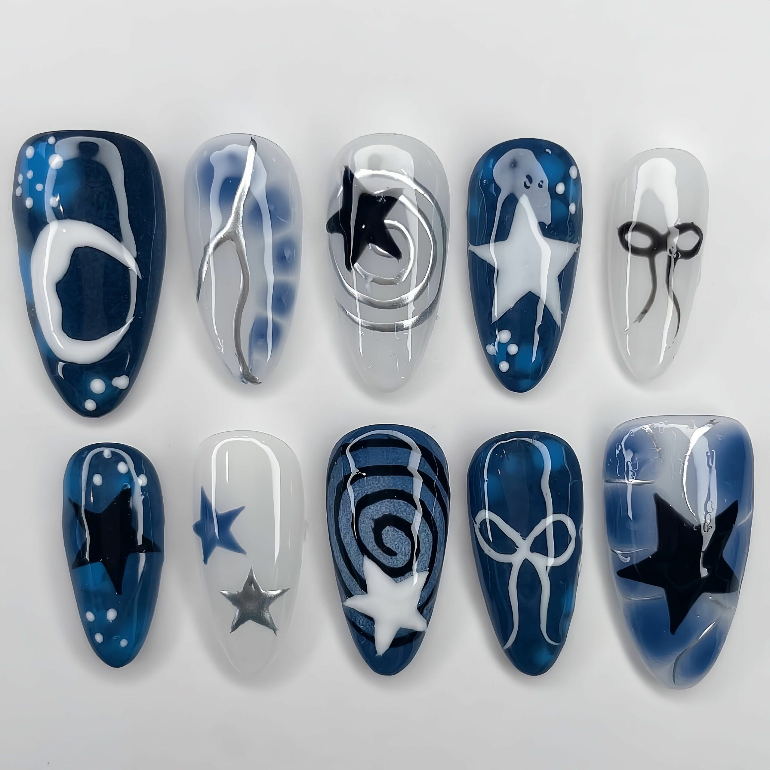 Custom press-on nails with hand-painted blue design, 3D and gel/acrylic options, perfect gift for girls.