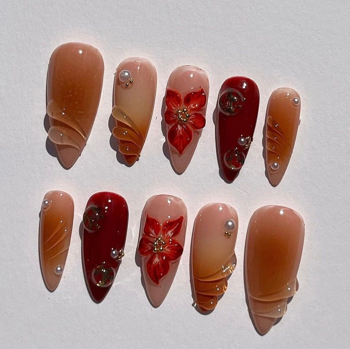 Handmade ombre 3D flower press on nails for a stylish and unique look. Customizable options available.