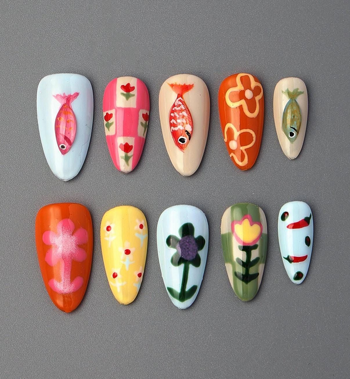 3D Gel Fish Flower Acrylic Press on Short Almond Nails, Reusable Hand-painted Fake Nails.