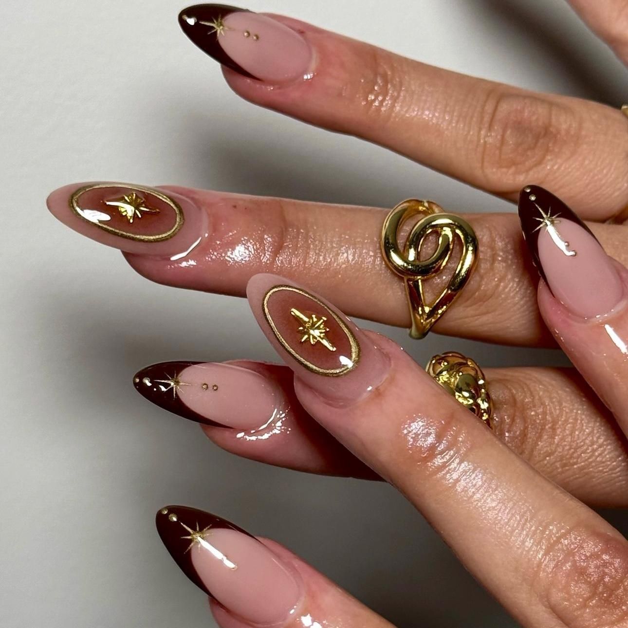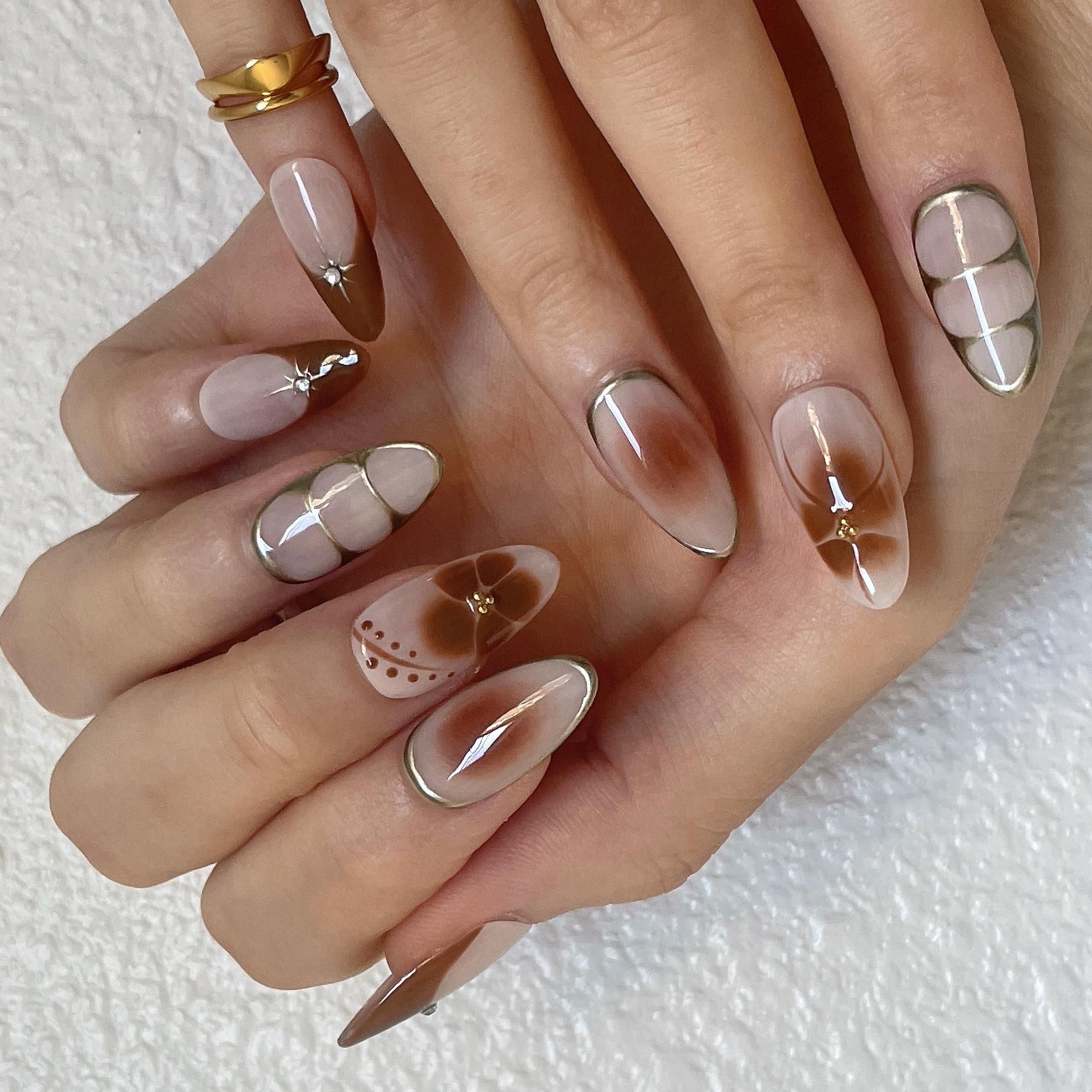 Handmade Brown Almond Press-On Nails with Dreamy Floral Y2K Design for Fall Gel Nails.