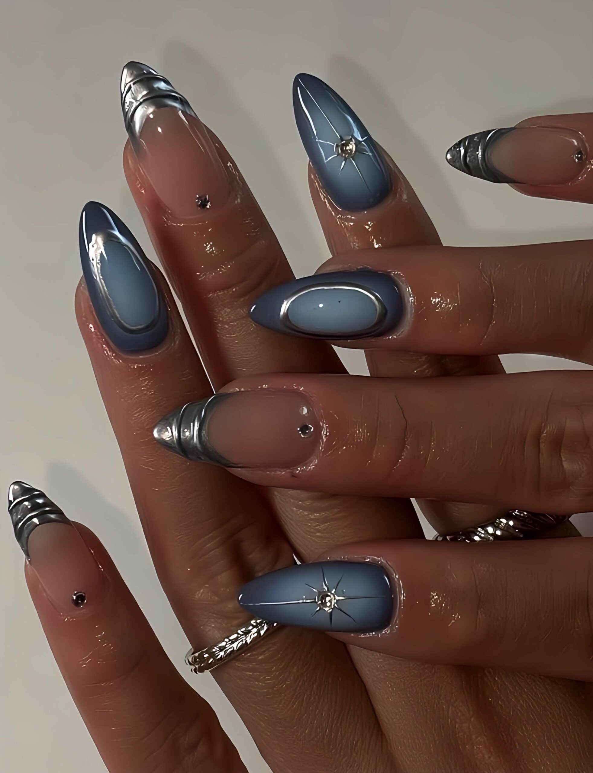 “Silver Y2k Art Nails with Pearl Designs – Long Almond-Shaped Press-On False Nails”