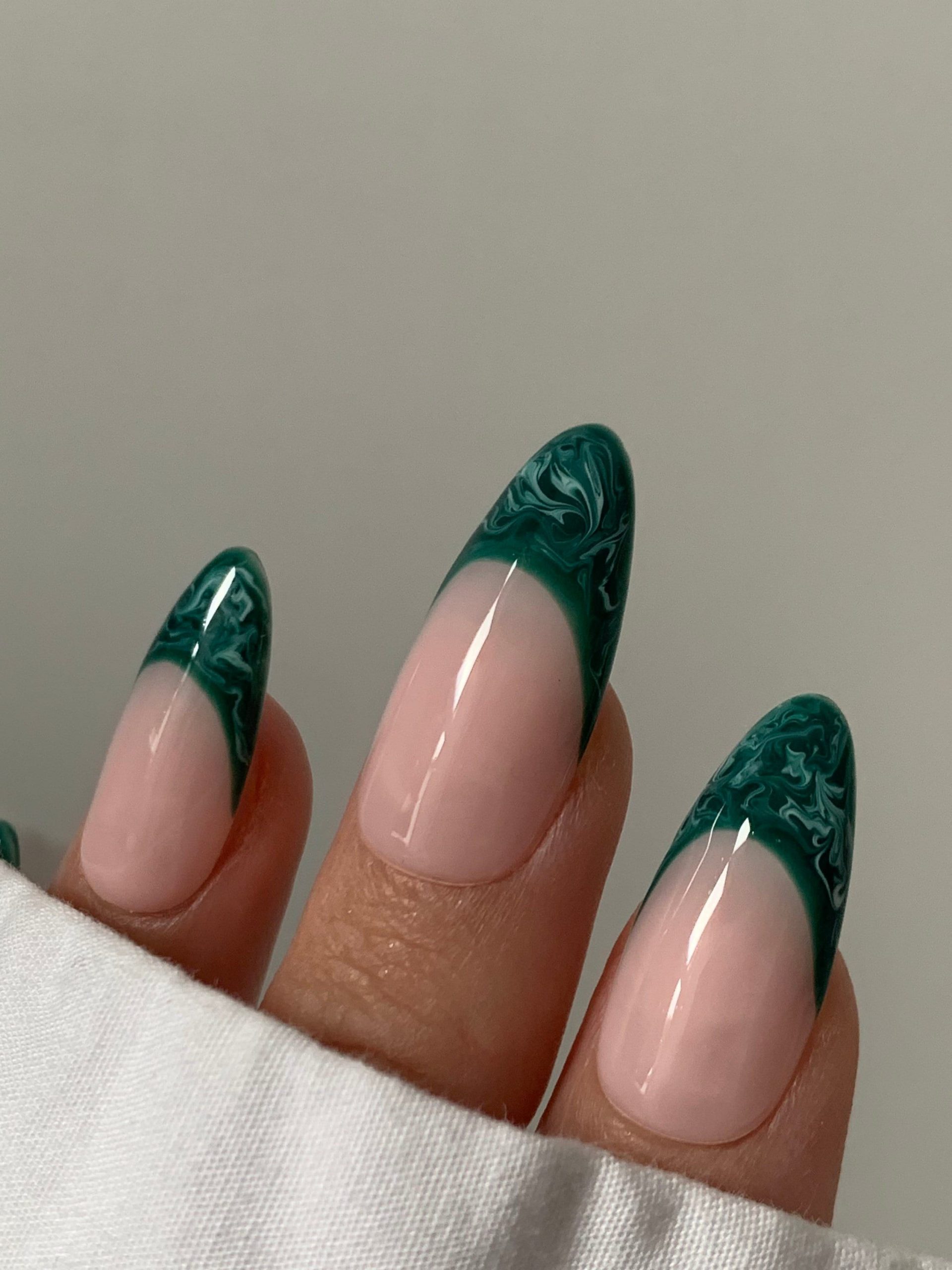 “Hand Painted Deep Green Marble French Press on Nails – Salon Quality Marble Design”