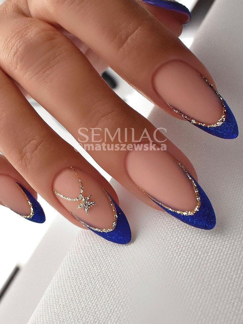 “2024 Nail Trends: Elegant Short Square Royal & Navy Blue Designs with Sparkle & Simplicity.”