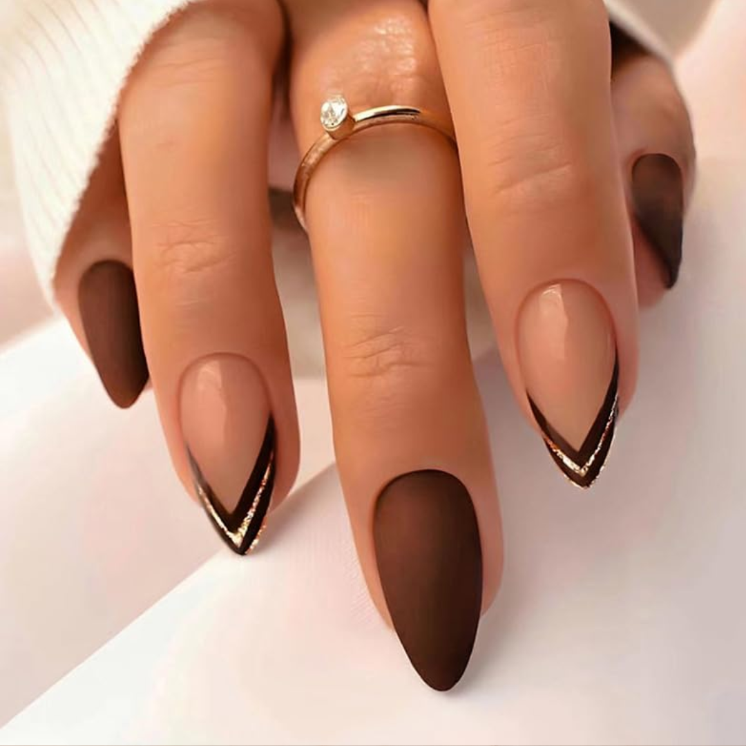 “Get flawless French tip press-on nails in dark brown medium pointed almond shape.” (15 words)