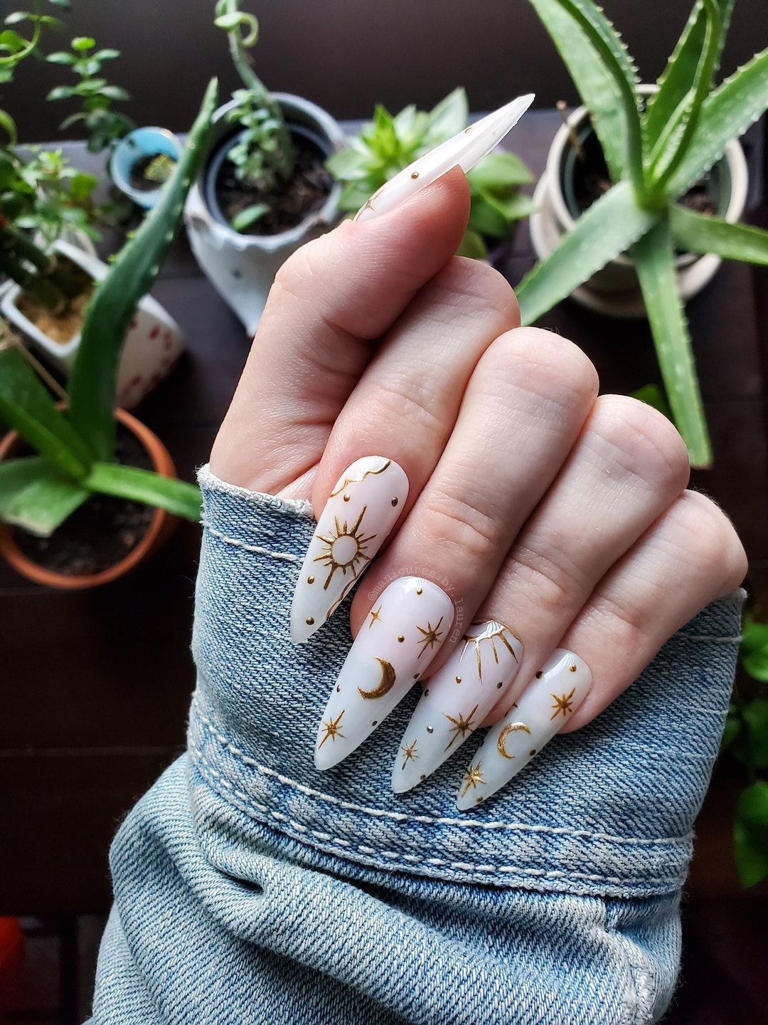 “Shine like a star with these gold chrome celestial press on nails for a glamorous look.”
