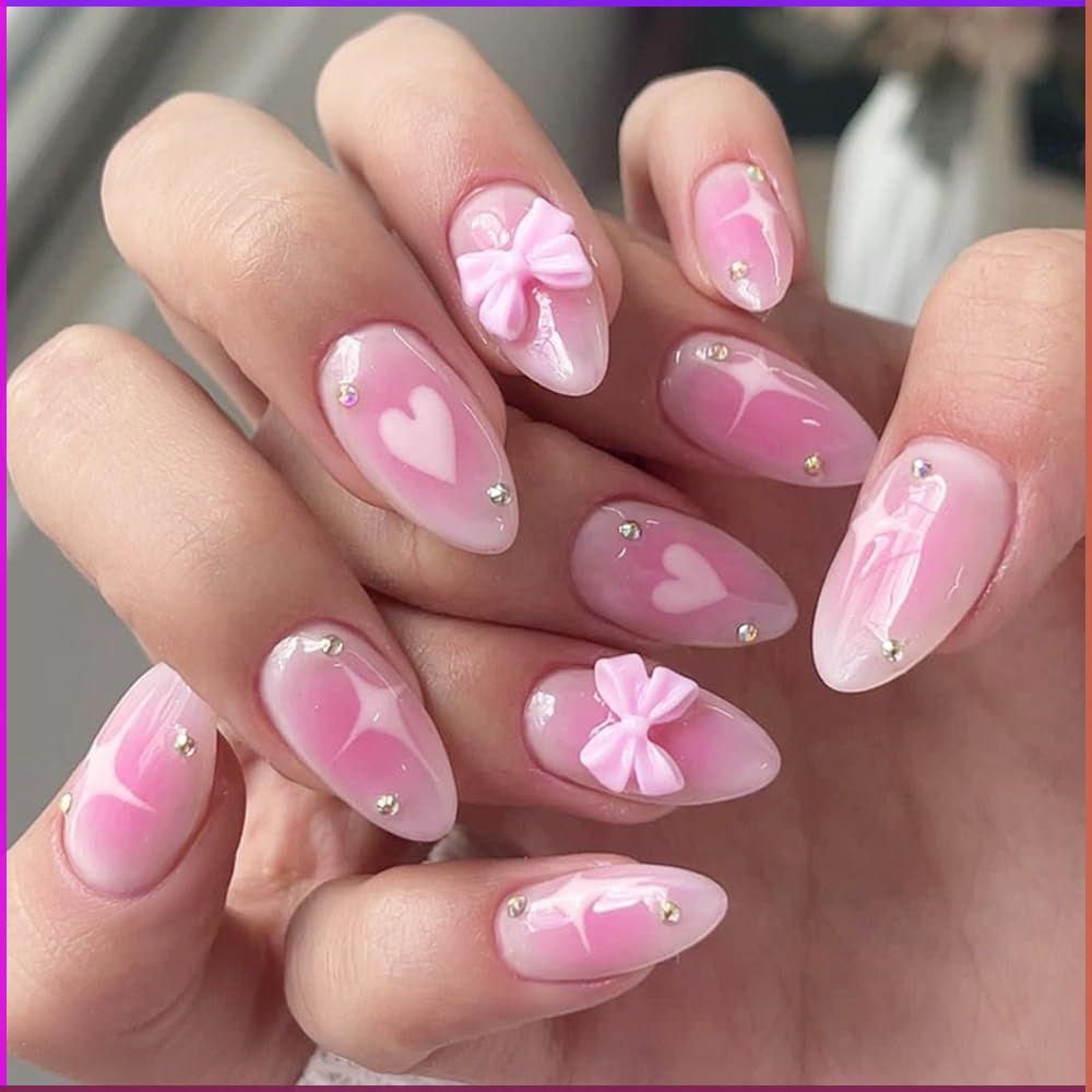 Almond Press on Nails Medium Fake Nails Pink Ombre with Heart Star Design 3D Bow Glossy Acrylic Nails.