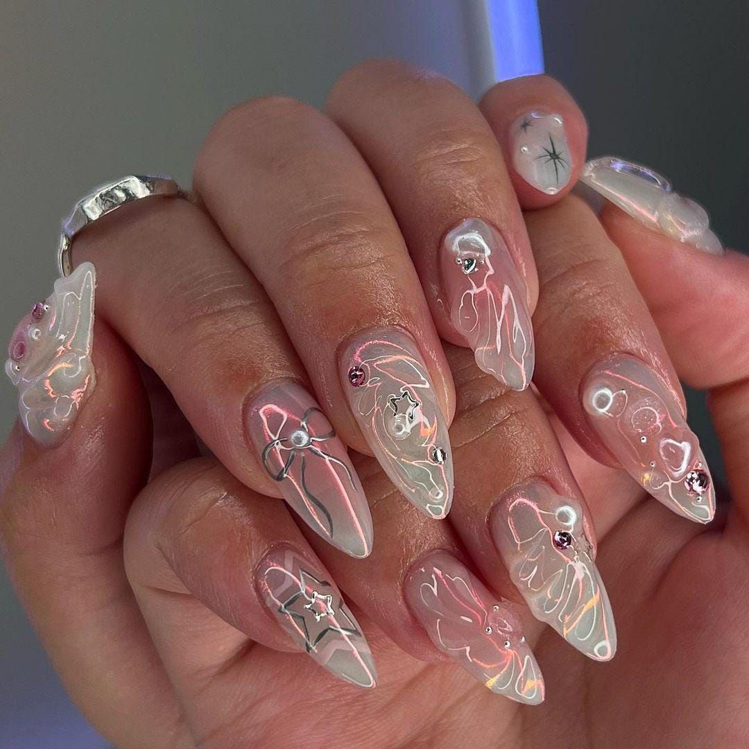 Charming Pink Bow Press-On Nails | Sparkling Star Charms & Pearl Elegance Y2k Nails, Spring Nails.