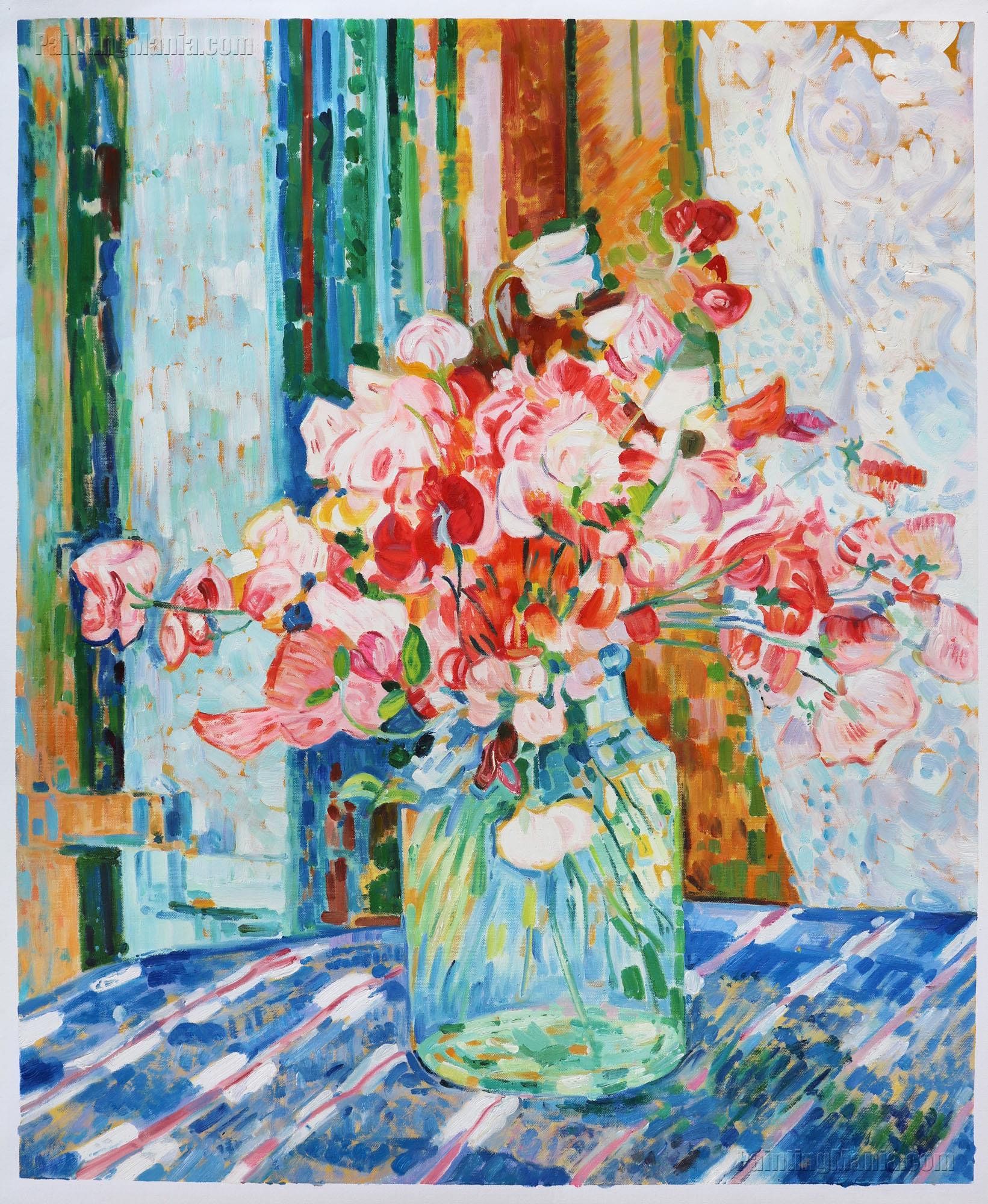 “Hand-Painted Sweet Peas Theo Van Rysselberghe Oil Painting Reproduction, Red Flower Bouquet Still Life with Bottle, Birthday Gift”