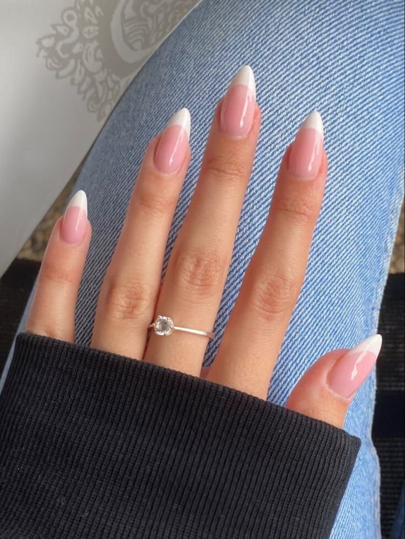 “Get flawless French tip press-on nails in dark brown medium pointed almond shape.” (15 words)