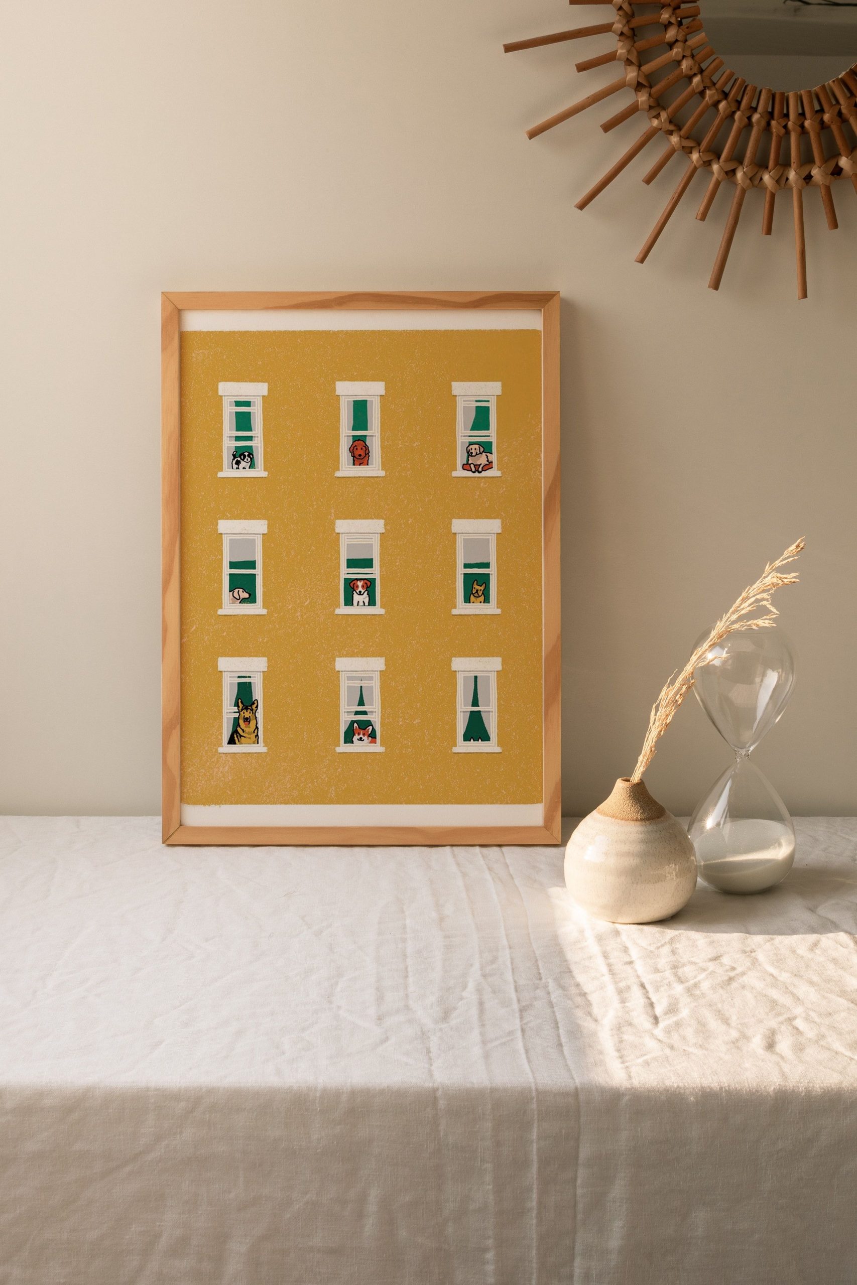 “Charming Dogs In The Windows Art Print – Perfect for Dog Lovers”