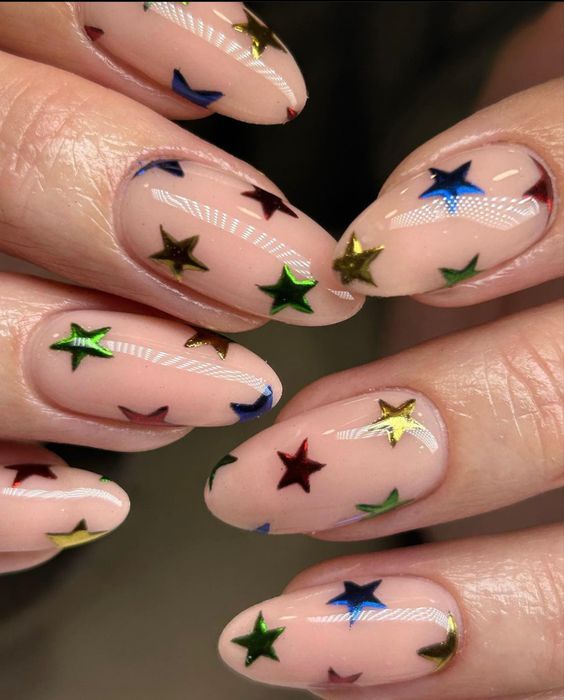 Embrace the beauty of fall with a stunning fall leaves nail design. Start by painting your nails with a nude base color. Use a thin brush to create different colored leaves on each nail, including shades of red, orange, yellow, and brown. Add some gold accents for a touch of elegance.