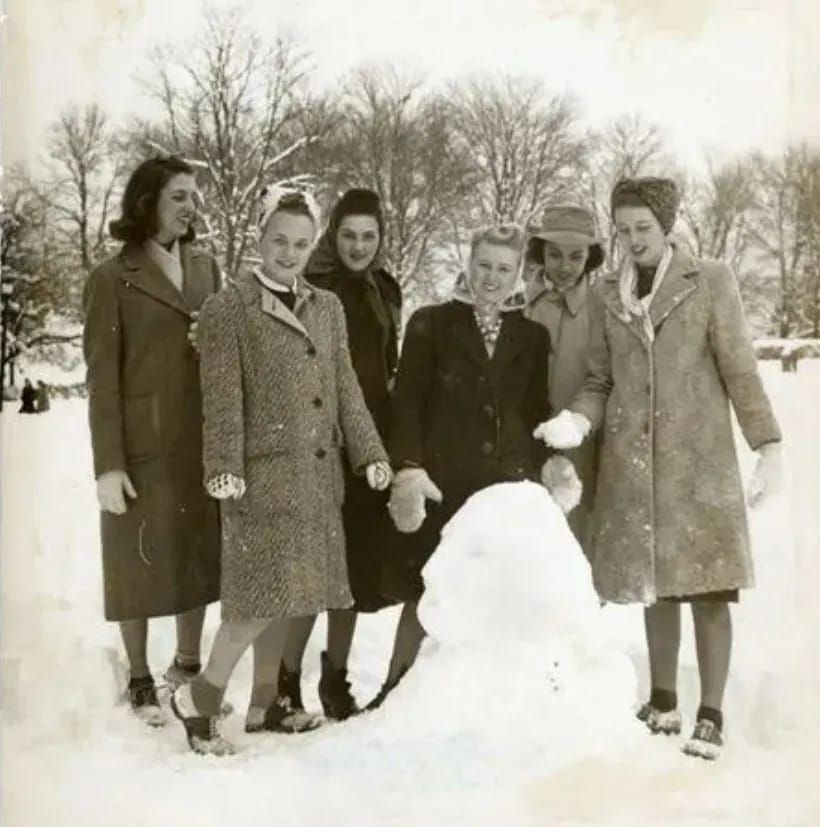 “Vintage 1940s Winter Fashion: Young Women in Coats, Hats, and Headscarves”